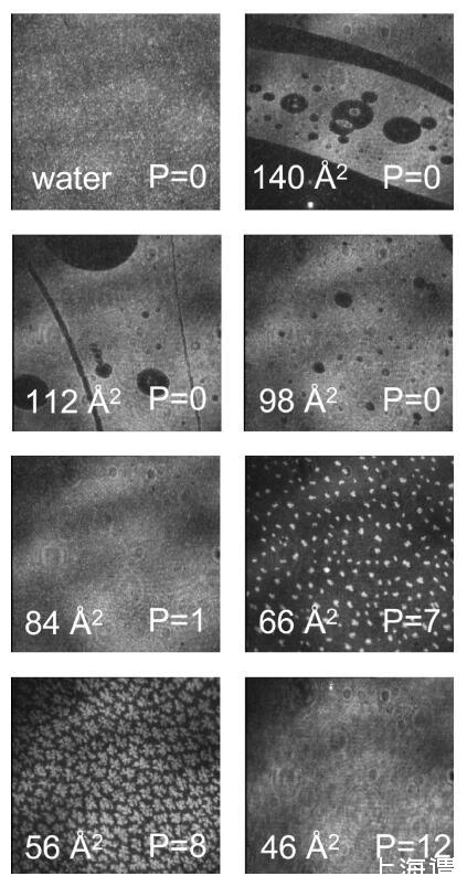 圖3。水上不同密度DPPC的布儒斯特角顯微鏡圖像。圖像大小為600×600μm。白色區域表示高密度,而黑色區域表示低密度。在每個面板中,每個分子的面積(單位為?2)在左下角報告,表面壓力(單位為mN/m)在右下角報告。這些照片是用自動調整靈敏度的相機拍攝的,這樣就無法比較圖像之間的灰度等級。