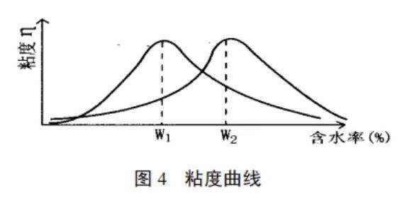 含水量高則流動性好(即每個顆粒表層水膜厚),但凝聚性差,坯體易變形。因此,對每一企業來講,在原料處理、擠泥機等條件固定的前提下,摸索一個合適的成型含水率,既利于擠泥機成型,又利于磚坯強度。根據我們對幾十種黏土的試驗數據,每種黏土都有一個最佳含水率,在這種含水率的情況下,黏土的粘性(稠度)最好。典型的粘度曲線(見圖4):