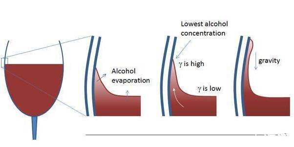 瑪拉高尼效應(yīng)不光存在于物理實(shí)驗(yàn)和我們之前開的玩笑之中,在我們的日常生活中也有馬拉高尼效應(yīng)的體現(xiàn),這一現(xiàn)象可能每一個(gè)人都見過,那么就是我們?cè)诤染频倪^程中看到的所謂的好酒會(huì)掛壁的現(xiàn)象。就算再好的酒,它也是有水在其中的。好酒中的酒精由于毛細(xì)效應(yīng)爬到高處的時(shí)候,酒精蒸發(fā),使得處于上層的酒液的酒精含量相比較于下層來(lái)說(shuō)要低,而同時(shí)的酒的表面張力要比水小,兩種液體表面張力的差距就形成了馬拉高尼效應(yīng)。
