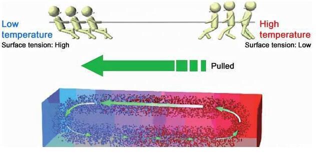 在兩種液體相互接觸的時(shí)候,表面張力強(qiáng)的液體會(huì)將表面張力弱的液體拉過來(lái),這股力會(huì)將表面張力弱的液體反向倒吸進(jìn)表面張力強(qiáng)的液體之中,科學(xué)家將這一現(xiàn)象命名為馬拉高尼效應(yīng)。導(dǎo)致這一現(xiàn)象發(fā)生的條件有很多,比如液體的濃度含量,溫度的高低都會(huì)讓兩種液體產(chǎn)生馬拉高尼效應(yīng)。