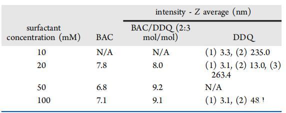 光子相關(guān)光譜(PCS)用于測定膠束的流體動(dòng)力學(xué)直徑。BAC和BAQ/DDQ 2:3 mol/mol的PCS分布圖(圖1b)顯示了在相關(guān)濃度范圍內(nèi)的單峰分布,平均Z平均值和單峰分布表明存在橢球或球形膠束幾何結(jié)構(gòu)。DDQ呈現(xiàn)雙峰/三峰分布,表明膠束結(jié)構(gòu)具有較大的聚集數(shù)(表4)。這可以用具有徑向長度和軸向長度的圓柱形幾何體或與單分子或多分子囊泡平衡的球形膠束來解釋。28這兩種情況與早期DDQ熒光探針研究的結(jié)果一致,該研究觀察到膠束聚集數(shù)從20增加到86,濃度從10增加到81 mM。29