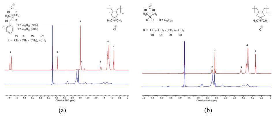 圖3:。樣品頂相和底相的1 H NMR:(a)pDADMAC 8.5 kDa(3 wt%)/BAC(3 wt%)/水樣和(b)pDADMAC 8.5 kDa(3 wt%)/DDQ(3 wt%)/水樣,自上次攪拌后24 H。(紅色)頂相(表面活性劑)和(藍(lán)色)底相(pDADMAC)。