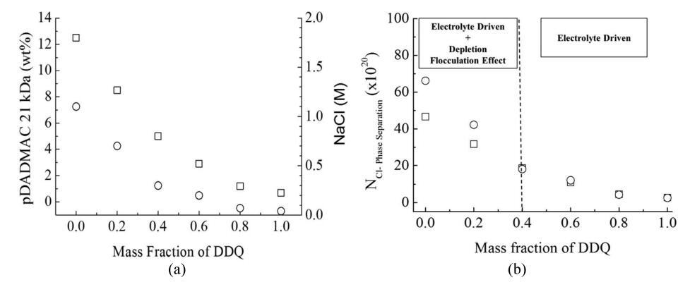 圖5:。(a)臨界相分離濃度與BAC/DDQ質(zhì)量比的函數(shù)關(guān)系。表面活性劑(BAC/DDQ)濃度保持恒定(100 mM≈3.6 wt%):(○)NaCl和(□)pDADMAC(21 kDa)。(b)誘導(dǎo)相分離所需的電解液中氯離子的數(shù)量(NCl?相分離)作為BAC/DDQ比的函數(shù)。表面活性劑(BAC/DDQ)濃度保持不變(100 mM/≈3.6 wt%)。電解液類型:(○)NaCl和(□)pDADMAC(21 kDa)。