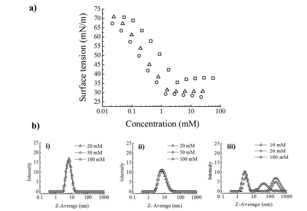 圖1:。(a)25°C水中的表面張力曲線(□)美國銀行(○)DDQ和(Δ)BAC/DDQ(2:3 mol/mol)。(b)25°C下的PCS強(qiáng)度曲線隨濃度變化:(i)BAC(0.3 M NaCl),(ii)BAC/DDQ 2:3 mol/mol(0.05 M NaCl),和(iii)DDQ(5×10?3 M NaCl)。