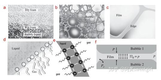 圖1.不同尺度下的泡沫結構及穩定機制(Ref 1)(a)整個泡沫結構,尺度為0.01 m至1 m。(b)干泡沫的放大部分,尺度為0.1 mm至1 cm。(c)液體通道,也叫Plateau邊界,尺度為1 um至0.1 mm以及肥皂泡膜,尺度為10 nm到1 um。(d)氣液界面的分子層結構,尺度為0.1 nm到10 nm。e-f)氣泡膜在界面靜電力排斥作用即楔裂壓(disjoining pressure)的作用下而穩定存在。