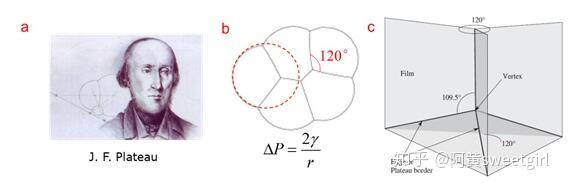 泡沫物理學集中于研究泡沫的結構、靜力學、動態演變及排液等內容。它是一個十分古老的學科,由比利時物理學家Plateau在19世紀中葉開創(圖2a)。Plateau在數十年的失明的時光里,依舊通過指導他侄子做試驗,堅持研究肥皂泡薄膜的幾何形態及其背后隱藏的力學規律。1873年,他和侄子把自己的實驗現象和分析結果做了系統整理,以法文發表,從此把對泡沫結構的研究由定性印象推到了量化階段,開創了泡沫物理學(Ref 2)。在泡沫靜力學方面,Plateau的主要貢獻在于其提出了干泡沫的靜態結構力學的三定律,它是后續泡沫研究的基石: