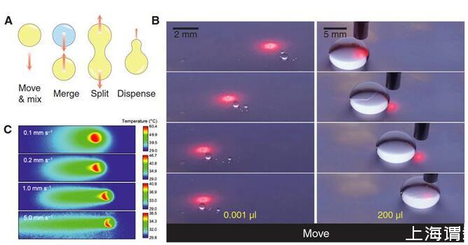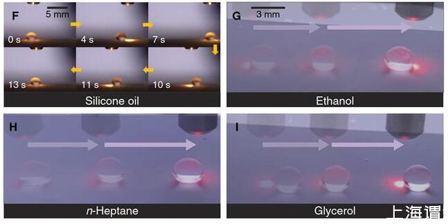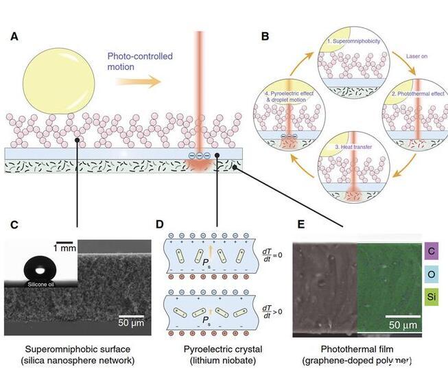 光電微流控平臺(tái)的設(shè)計(jì):微流控平臺(tái)包括底層的光熱薄膜(石墨烯摻雜的PDMS),中間層的熱釋電晶體(LiNbO3)和上層的超疏液涂層(SiO2納米空心球分形網(wǎng)絡(luò))(圖1)。光束可以穿過上層透明的超疏液涂層和熱釋電晶體照射到底面的光熱薄膜,光熱薄膜將光能轉(zhuǎn)換成熱能使自身溫度升高,從而加熱上方的熱釋電晶體在光束照射處產(chǎn)生表面電荷,當(dāng)電荷引起的介電泳力足以克服液滴在超疏液涂層上的粘附力,液滴則被吸引至光束下方。超疏液涂層不僅為液滴移動(dòng)創(chuàng)造了極低的阻力,而且避免了液體殘留,使得無損液滴操控成為可能,可以對(duì)包括硅油、乙醇、正庚烷和甘油在內(nèi)的30多種液體(表面張力18.9-98.0mN/m)進(jìn)行無損光控操作。