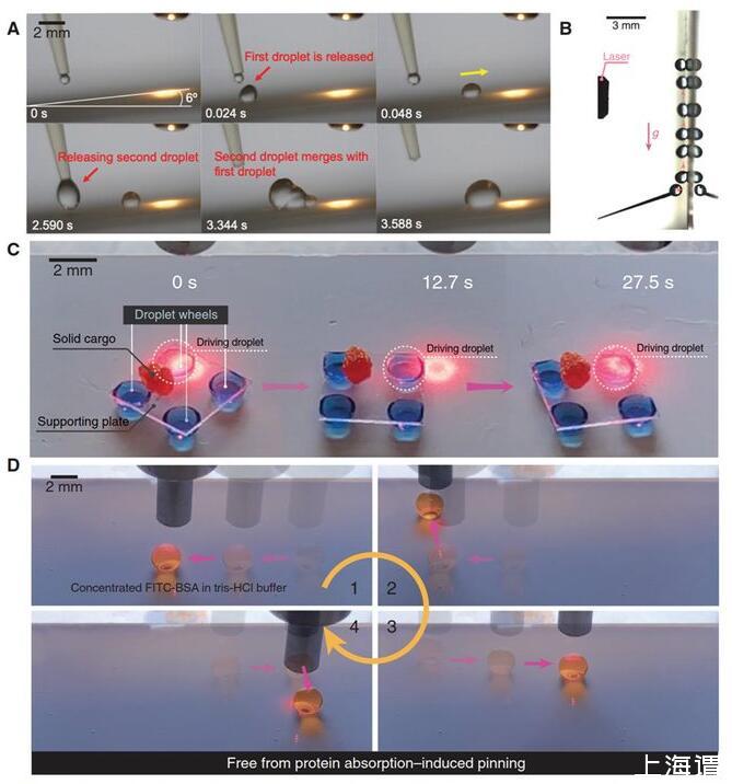 多樣化應(yīng)用:光電微流控技術(shù)可將液滴定向傳輸甚至反重力爬升,在霧氣收集、3D打印、傳熱傳質(zhì)等領(lǐng)域極具應(yīng)用前景;對(duì)液滴的精確操控還造就了以液滴為驅(qū)動(dòng)元件的軟體機(jī)器人,可用于信息通訊、固體傳輸、載藥釋放等關(guān)鍵領(lǐng)域;對(duì)高濃度蛋白質(zhì)等生物流體的無損操控使得微反應(yīng)裝置的重復(fù)再用成為可能,有利于減少一次性塑料的使用、減少醫(yī)療廢品、降低成本,助力醫(yī)療檢測(cè)、生化分析、微流控等領(lǐng)域的綠色、環(huán)保、可持續(xù)發(fā)展。利用光束精準(zhǔn)遙控各種微液滴,應(yīng)用于病理測(cè)試,可避免與感染性流體直接接觸,有利降低一線醫(yī)務(wù)人員在大流行病中測(cè)試病毒或細(xì)菌的感染風(fēng)險(xiǎn),以及減少樣本在操控過程中污染的機(jī)會(huì)。