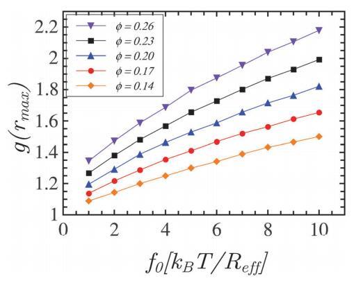 圖7顯示了面積分數的五個代表值的g(rmax)作為f0的函數,單位為kBT/Reff。