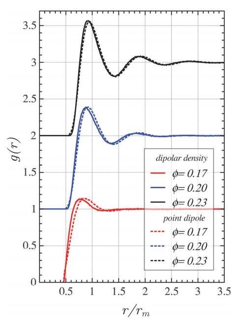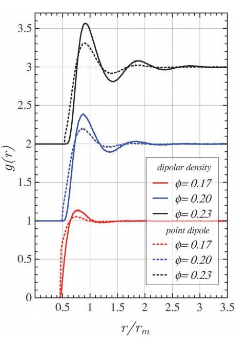 在第一個峰值位置和g(r)開始偏離零的小區域觀察到輕微差異。當系統更加結構化時,協議會得到改善。特別是,對于弱相互作用域,差異開始明顯。這些偏差是由于點偶極力在接觸時趨于有限值,而在偶極密度情況下,它會發散。因此,硬盤相互作用與點偶極子模型有關。