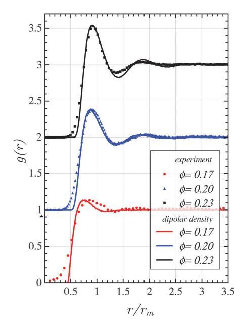 我們還研究了點偶極子模型,以探討其作為偶極密度模型近似值的有效性。通過分析徑向分布函數,我們發現點偶極子模型嚴重低估了結構。然而,如果將點偶極子強度視為擬合參數,即有效相互作用強度,則可以實現良好的一致性。對于不同的面積分數,我們確定了f0的廣泛范圍內的f p0。模型之間的這種關系允許使用更簡單的點偶極模型來計算具有已知偶極斥力的單層的結構,并從實驗g(r)中獲得偶極斥力。