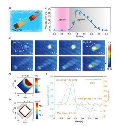 研究人員研制的驅動薄膜中具有光熱效應極好的氧化石墨烯(GO)材料,可將光能轉換成熱能,當光照射漂浮于水面上的驅動薄膜時,薄膜會產生一定的溫度并傳遞給周圍的液體,造成局部水溫升高進而影響水的表面張力。