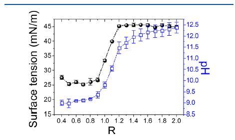 圖3.氫氧化膽堿/肉豆蔻酸分散體的表面張力(黑色圓圈)和pH(藍色正方形)隨25°C下摩爾比R的變化。