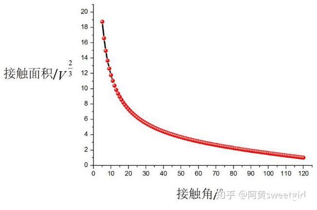 上圖是接觸角從5°到120°范圍內(nèi)的接觸面積的變化關(guān)系,基本上涵蓋了自然界中的大多數(shù)物質(zhì)的光滑固體表面。