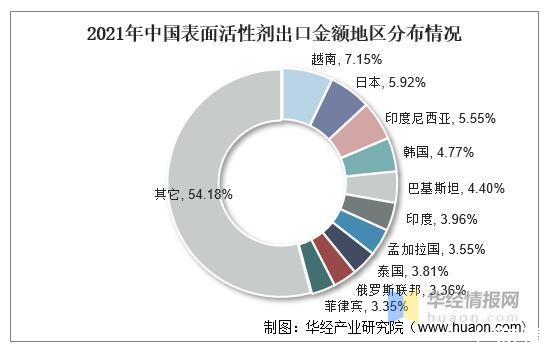從出口分布來看,2021年我國表面活性劑出口金額中,占比前三的地區分別為印度、日本和印度尼西亞,占比分別為7.15%、5.92%和5.55%。