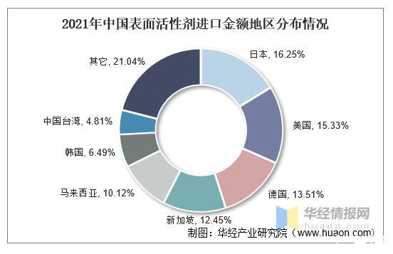 從進口分布來看,2021年我國表面活性劑進口金額中,占比前三的地區分別為日本、美國和德國,占比分別為16.25%、15.33%和13.51%。