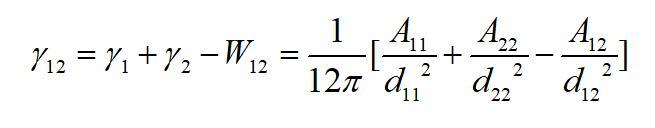 為物質(zhì)1的Hamaker常數(shù)。該作用勢能就相當(dāng)于本體的內(nèi)聚功。從表面自由能的定義不難看出,當(dāng)將本體沿本體內(nèi)的一個(gè)界面分開時(shí),單位面積需要克服內(nèi)聚力所做的功就等于這個(gè)作用勢能。由于分開后形成兩個(gè)新表面,因此每個(gè)表面上的勢能等于該勢能的一半。因此物體的表面自由能(表面張力)也等于該作用勢能的一半,即