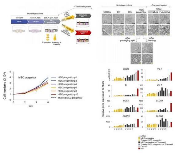 鑒于此,韓國生命工學(xué)研究院的一項研究開發(fā)了一種重復(fù)性良好的兩步方法來誘導(dǎo)人多能干細(xì)胞分化為可擴(kuò)大的hIEC祖細(xì)胞和具有功能性的hIEC單層細(xì)胞。