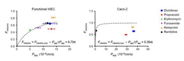 隨后,研究分析了各種腸道轉(zhuǎn)運體和代謝酶的表達(dá)水平,通過RNA測序與酶活性檢測,發(fā)現(xiàn)腸道堿性磷酸酶(IAP)和CYP3A4在功能性hIEC中表達(dá)量相當(dāng)高,這些結(jié)果表明功能性hIEC具有藥物轉(zhuǎn)運體和藥物代謝酶活性,是評價藥物體外生物利用度所必需的。本研究使用了6種臨床藥物:美托洛爾、普萘洛爾、雙氯芬酸、雷尼替丁、呋塞米和紅霉素,進(jìn)行體外藥物吸收試驗,發(fā)現(xiàn)與Caco-2模型不理想的體內(nèi)外相關(guān)性相比,功能性hIEC與已公布的人體內(nèi)腸道吸收數(shù)據(jù)擬合的相關(guān)性良好,說明功能性hIEC可以更好地預(yù)測人的口服生物利用度和吸收程度。