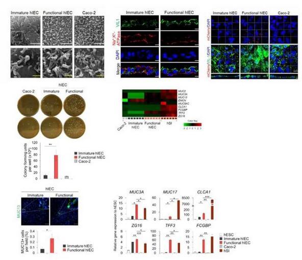 由于在hSI中,Wnt的抑制和Notch的激活有助于祖細(xì)胞分化為吸收前上皮細(xì)胞,研究者使用了Wnt信號抑制劑Wnt-c59和Notch信號激動劑丙戊酸(VPA),來進(jìn)一步將hIEC祖細(xì)胞分化為與體內(nèi)類似的成熟且有功能的hIEC。與其他僅由吸收性腸細(xì)胞組成的小腸上皮模型相比,該系統(tǒng)可以模擬體內(nèi)樣腸組織進(jìn)行研究。與未成熟的hIECs相比,功能性hIECs形成了一個結(jié)構(gòu)極化的單層,并觀察到了類似杯狀細(xì)胞分泌出的粘液。此外,功能性單分子層hIEC的頂表面接觸的細(xì)菌數(shù)量明顯更高,并且黏液蛋白和黏液蛋白相關(guān)基因的表達(dá)在功能性hIEC中顯著增加能夠允許腸道微生物群的持續(xù)定植。