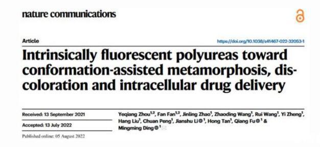 1.Zhou,Y.,Fan,F.,Zhao,J.,Wang,Z.,Wang,R.,Zheng,Y.,...&Ding,M.Intrinsically fluorescent polyureas toward conformation-assisted metamorphosis,discoloration and intracellular drug delivery.Nature communications 2022,13,4551
