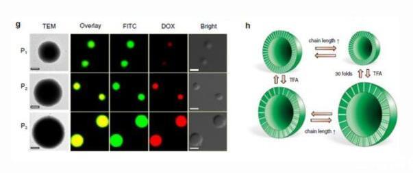 當加入三氟乙酸試劑之后,即可調控氫鍵的相互作用,實現囊泡的可逆"呼吸"。同時,囊泡的尺寸也能在5-30倍的范圍內實現可逆變化。