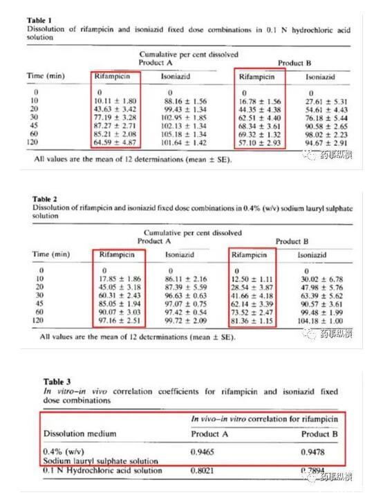 利福平與異煙肼復(fù)方制劑在進(jìn)行溶出曲線測定時發(fā)現(xiàn)利福平在0.1N鹽酸中不穩(wěn)定,發(fā)生降解。由于利福平在水中不溶,因此采用了0.4%SDS溶液進(jìn)行了研究,結(jié)果表明在整個分析檢測過程中無降解。而且,0.4%SDS溶液的體內(nèi)外相關(guān)性很好。