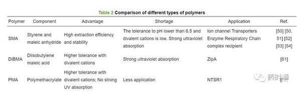 盡管SMA和DIBMA在一些MPs的分離純化中取得了成功[63],但存在SMA對二價陽離子耐受性低、DIBMA提取純度和穩(wěn)定性低的缺陷并且這兩種聚合物都有強烈的紫外吸收,可能干擾紫外檢測[57]。因此人們開始尋找非“烯烴-馬來酸支架”替代聚合物。最近,兩親性聚甲基丙烯酸酯聚合物(polymethacrylate,PMA)被證明可將脂質(zhì)雙分子層溶解成納米圓盤。PMA比常見的苯乙烯-馬來酸聚合物具有潛在的優(yōu)勢,但目前PMA對于MPs的純化應(yīng)用較少[64]。Lavington等[63]以神經(jīng)緊張素受體1(NTSR1)為對象,探索使用PMA的無洗滌劑純化。通過使用Sf9細胞中表達的NTSR1-eGFP融合蛋白,篩選了一系列的增溶條件,證明了溫度、pH、NaCl濃度以及聚合物和膜樣品的相對數(shù)量的重要性。此外還發(fā)現(xiàn)PMA對二價陽離子有一定耐受性。PMA溶解的NTSR1比洗滌劑溶解的NTSR1表現(xiàn)出更大活性,這表明PMALPs為NTSR1提供了更天然的膜環(huán)境[63]。因此,PMA是一種可替代SMA的MPs純化方法,在研究NTSR1和其他MPs方面具有良好的前景。表2比較了SMA、DIBMA、PMA的組成、優(yōu)缺點及其應(yīng)用。