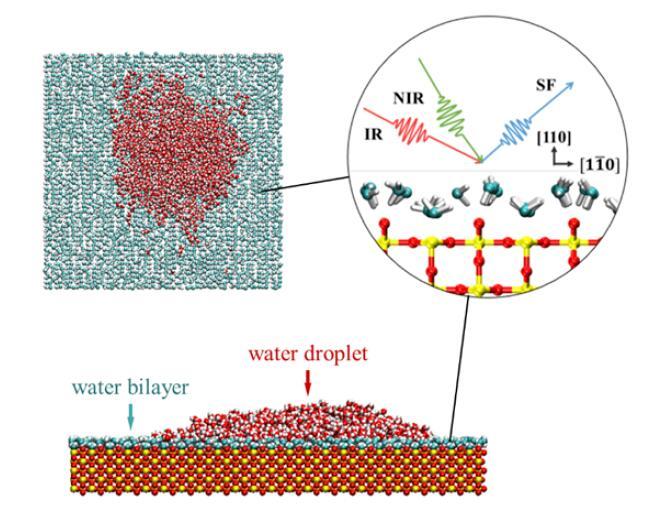 以TiO2的Rutile晶型110表面為例,和頻共振光譜實驗與理論發現常溫下該表面上有序雙層水結構,且該有序結構導致水層上水滴存在。