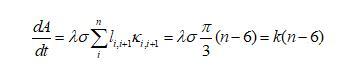 下面我們推導二維泡沫的演變方程,由于任一氣泡跟周圍氣泡的氣體交換都是通過氣泡邊界進行的,則氣泡體積(二維氣泡用面積表示)隨時間的變化率跟邊界長度和邊界上的壓強差都有關系,可以表示為