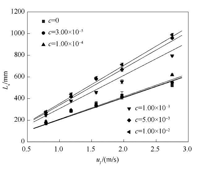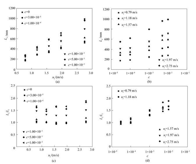 為了定量表征表面張力變化對射流破裂過程的影響,實驗測量了含表面活性劑射流的射流破裂長度。射流破裂長度定義為噴嘴出口至射流首次發生破裂處的距離。圖6是含表面活性劑射流破裂長度隨射流速度u l的變化趨勢,其中L s(mm)表示含表面活性劑射流的射流破裂長度,L l(mm)為水的射流破裂長度。從圖6(a)中可以看出,當表面活性劑濃度保持不變時,提高液體射流速度會增大射流破裂長度。從圖6(b)中可以看出,當液體射流速度保持不變時,隨著表面活性劑濃度的增大,射流破裂長度總體上呈現逐漸增大的趨勢;射流速度越大,射流破裂長度增大的趨勢就越明顯。使用相同工況下水的射流破裂長度無量綱化含表面活性劑射流的破裂長度后,可以得到射流破裂長度比隨射流速度以及表面活性劑濃度的變化趨勢,如圖6(c)、(d)所示。從圖中可以看出,表面活性劑的加入顯著增大了射流破裂長度比。在表面活性劑濃度不變時,提高液體射流速度對射流破裂長度比的影響并不顯著。在射流速度保持不變時,提高表面活性劑濃度會導致射流破裂長度比的增大。