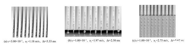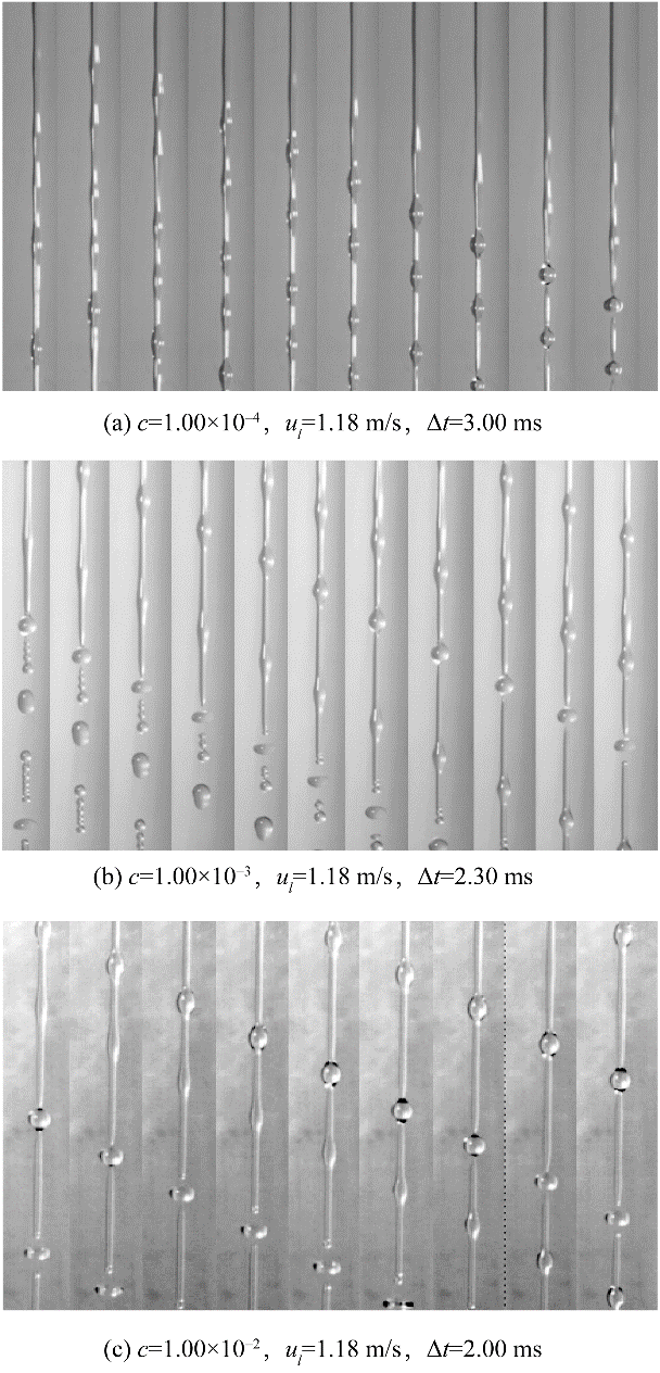 本文首先研究了不含氣泡的表面活性劑射流破裂過程以探究表面張力變化對射流破裂特征的影響。實驗使用高速相機記錄了六種不同濃度表面活性劑溶液的射流破裂過程。實驗獲得的射流破裂過程如圖5所示,其中Δt是相鄰兩張圖片間的時間間隔。從圖5中可以看出,雖然表面活性劑濃度并不相同,但射流的破裂過程在形態上是相似的。當液體射流離開噴嘴后,射流表面擾動迅速增長,表面波動在射流表面呈對稱分布,這是射流破裂Rayleigh區的典型特征。隨著表面波動的進一步發展,在射流方向上,射流表面形成瘤狀結構,射流破裂發生在兩個瘤狀結構之間。
