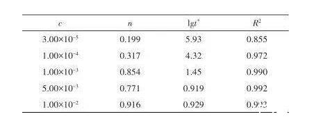 圖4展示了不同SDBS濃度下lg S隨lg t的變化規律,圖中實線對應各濃度下動態表面張力的擬合曲線,此時圖中時間t的單位為ms。從圖中可以看出,擬合結果與實驗數據吻合較好,擬合曲線能夠較好地表征動態表面張力的時間演變趨勢。擬合得到的系數見表1。