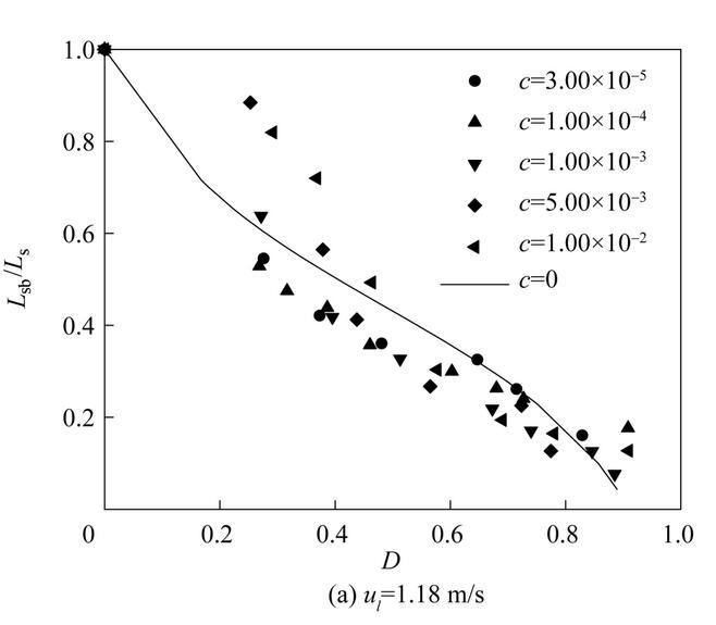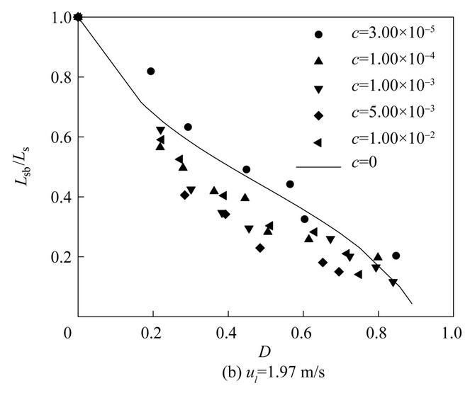 圖11是不同濃度表面活性劑射流破裂長度L sb隨氣泡無量綱直徑D=d b/d 0(d b為氣泡直徑)的變化。從圖中可以看出,不同表面活性劑濃度下,射流破裂長度隨氣泡無量綱直徑D的變化趨勢是相似的。射流破裂長度隨著氣泡直徑的增大逐漸減小;當氣泡直徑相同時,提高液體射流速度會導致更大的射流破裂長度。