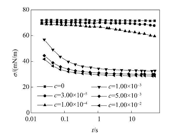 圖3不同濃度表面活性劑溶液的動態表面張力Fig.3Dynamic surface tension at various surfactant concentrations