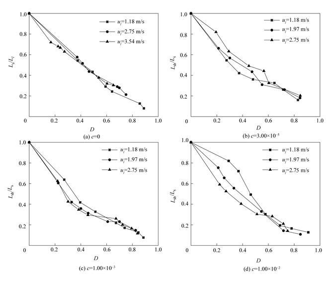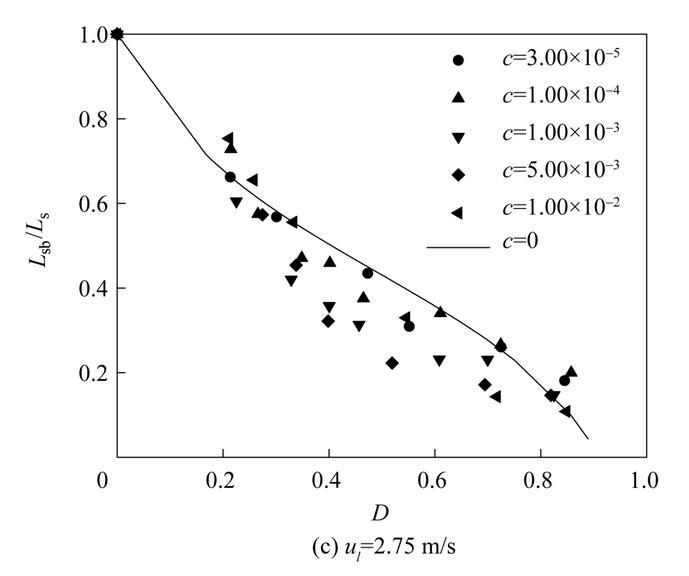 如圖12所示,當氣泡直徑較大時,破裂長度比基本不隨射流速度的改變而改變。這是由于此時氣泡引起的射流速度擾動對射流破裂的影響占主導地位。在氣泡直徑較小時,當表面活性劑濃度c<1.00×10-2,不同射流速度下射流破裂長度比基本相同。當表面活性劑濃度c=1.00×10-2,破裂長度比隨著射流速度的增大而逐漸減小。這可能與被削弱的Marangoni效應有關。由式(10)可知,液體射流速度越大,液體對流造成的表面活性劑表面吸附量減少的趨勢越強,波峰波谷間的表面張力差值越小,Marangoni效應越弱,射流破裂長度增加的趨勢越弱。因此,在氣泡較小時,隨著射流速度的增大,含氣泡射流的破裂長度比逐漸減小。在表面活性劑濃度較小時,氣泡的存在進一步減小了射流內部表面活性劑的濃度,從而使得不同射流速度下Marangoni效應的差別不明顯,不同射流速度下射流破裂長度比基本相同。