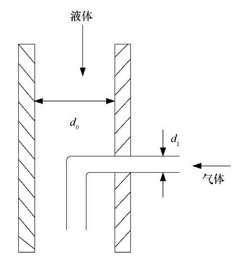 實驗流程如圖1所示。來自注射泵的氣體通過充氣通道進入噴嘴并在噴嘴內形成氣泡,并與來自液體流量計的液體相混合形成氣液混合物。該氣液混合物離開噴嘴后,在不穩定波的作用下發生破裂,使用高速相機記錄這一過程,并使用開源軟件ImageJ分析處理得到的圖片。實驗通過控制注入噴嘴的氣體流量從而得到不同液體射流速度下直徑近似相等的氣泡。實驗使用的噴嘴如圖2所示。其中,噴嘴內徑d 0=2.96 mm,充氣通道外徑d 1=0.50 mm。