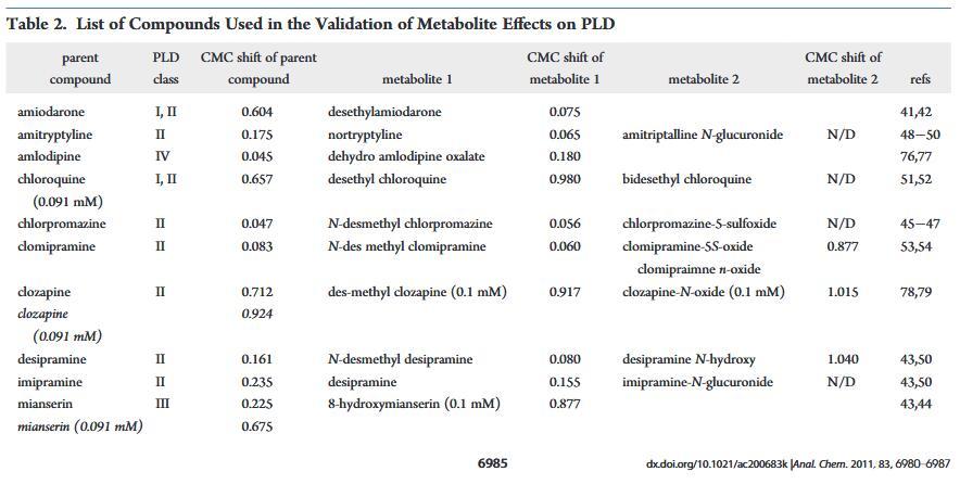 已經有許多出版物描述了PLD藥物代謝產物所致。其中,初級代謝輕的胺碘酮,去乙基胺碘酮,已經討論過14,38-40優先積累代謝物已觀察到胺碘酮過量,尤其是短期39這為我們的檢測數據提供了可能的解釋其中去乙基胺碘酮是胺碘酮的主要代謝物,41,42表現出更高的PLD誘導潛力。相似地,8-羥基米安色林之間的CMC位移差異,米安色林、43,44和米安色林的主要氧化代謝物比其他兩個之間的差異更顯著成對的親本和代謝物。由于溶解度的限制,父母和代謝組的劑量濃度不同氯氮平和米安色林。這可能是導致觀察到的CMC偏移的顯著差異母體和代謝物之間。在較低濃度下測試時相比之下,氯氮平從低電位誘導劑轉變為非誘導劑,而米安色林仍然作為誘導劑但具有更高的CMCDL/CMCL值。值得注意的是,目前測試集中的大多數CAD被報告為氧化代謝其相應的脫烷基初級代謝物。為了了解相應初級的PLD電位代謝物,我們測試了額外的代謝物。之間測試的代謝物是初級去甲基代謝物氯丙嗪、45?47阿米替林、48?50丙咪嗪、43,50和pri-氯喹的瑪麗和次級脫乙基代謝物。51,52此外,由雜原子氧化形成的氧化代謝物地昔帕明43,50和氯胺酮的重釋和脫烷基代謝物pramine53,54進行了評估。與其他CAD一樣,代謝物可以如果它們具有合適的理化性質,則誘導PLD。32相反,代謝物將失去結合能力如果CAD特征丟失,則使用脂質,例如用脂質觀察氯米帕明N-氧化物和地昔帕明N-羥基(圖4和表2)。