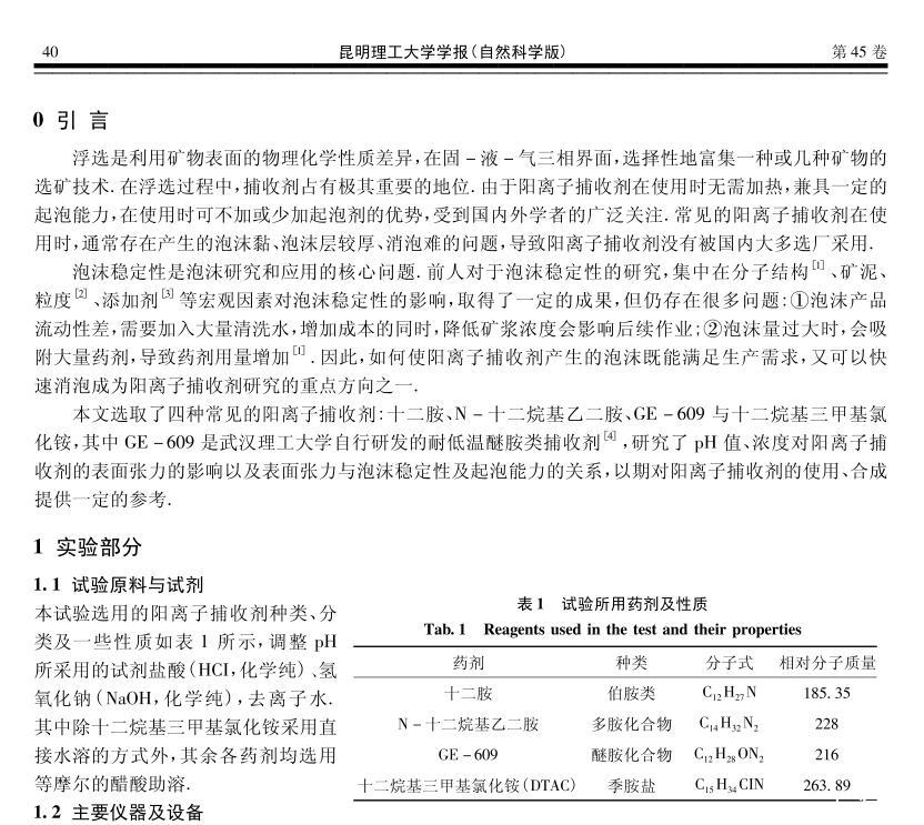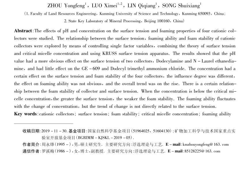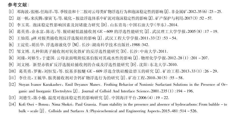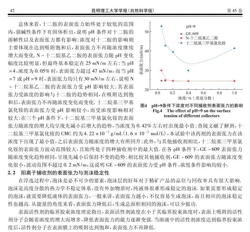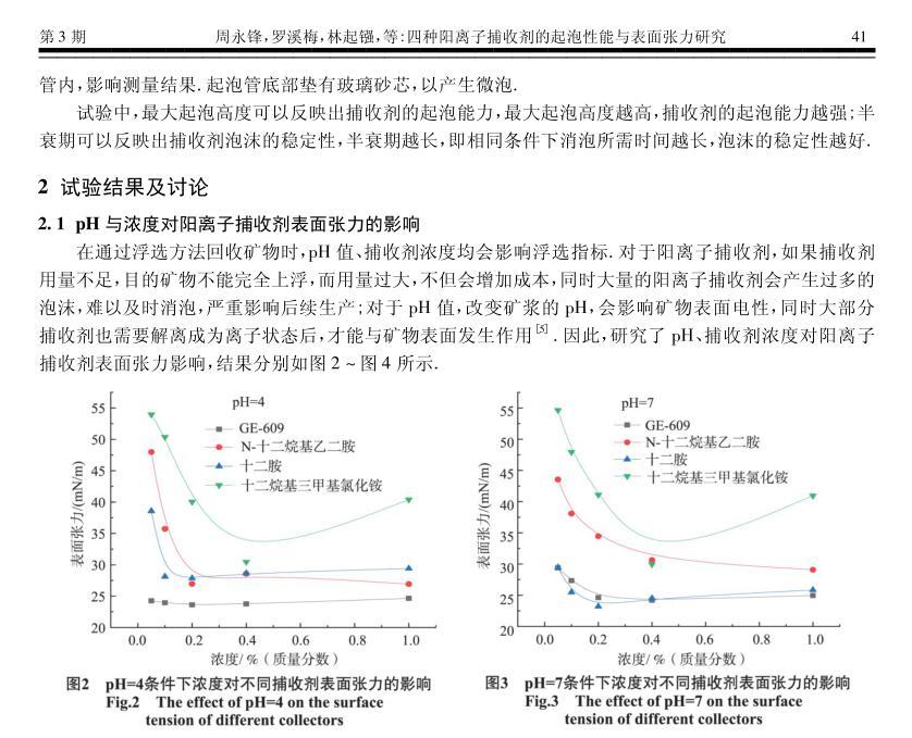 四種陽離子捕收劑的起泡性能與表面張力研究