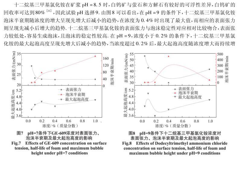 【摘要】:研究了不同pH和濃度對四種陽離子捕收劑表面張力以及起泡性能的影響.通過控制單因素變量,結合表面張力以及臨界膠束濃度的相關理論,采用KRUSS表面張力儀等設備研究了陽離子捕收劑的表面張力與起泡能力、泡沫穩(wěn)定性之間的關系。結果表明,pH值對十二胺、N-十二烷基乙二胺兩種捕收劑的表面張力影響較明顯,對GE-609(醚胺化合物)及十二烷基三甲基氯化銨的影響較小;濃度對四種捕收劑的表面張力及泡沫穩(wěn)定性都存在一定的影響,但影響程度不同,對起泡能力的影響不明顯,但總體呈上升趨勢。捕收劑的泡沫穩(wěn)定性與表面張力存在一定關系,當濃度小于臨界膠束濃度時,表面張力越大,泡沫穩(wěn)定性越弱,起泡能力隨濃度的變化存在一定波動,但變化趨勢與表面張力沒有直接的對應關系。