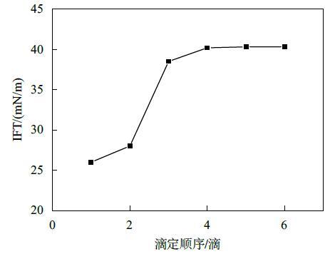 結(jié)果表明,液滴懸置5 min后,第一滴液滴表面張力值最小,隨著連續(xù)滴定的進行,液滴表面張力值逐漸增大,最終趨于平衡。究其原因,可能是由于懸置一段時間后,表面活性劑分子在表面充分吸附,所以第一滴液滴表面張力最小,而隨著連續(xù)滴定進行,由于平衡時間較短,表面活性劑分子在液滴的表面吸附未達平衡,所以數(shù)值逐漸增大,然而滴加液滴的速度一定,表面活性劑分子在表面的遷移速率一定,降低表面的能力與效率一定,最終會達到一個穩(wěn)定值。而平衡時間的長短,與表面活性劑分子的性質(zhì)有關(guān),遷移吸附速率快的表面活性劑分子所需時間較短。由此可見,使用懸滴法測定表面張力時,時間效應的影響不可忽略。