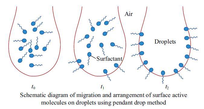 結(jié)果表明,在動態(tài)表面張力曲線圖中,A,B,C三種樣品在60 mg/kg的較低含量下,表面張力均呈現(xiàn)先快速降低而后緩慢降低最終達到平衡的趨勢,表明表面活性劑分子在液滴表面上確實存在著隨時間變化逐漸吸附平衡,排列完整的現(xiàn)象,如圖4所示,表面活性劑分子在表面完全吸附、排列緊密需要一定的時間,顯然在使用懸滴法進行測定時,時間效應直接影響著表面張力測定的誤差大小,符合前文所述結(jié)論。而樣品B在100 mg/kg含量下,動態(tài)表面張力趨勢圖成一條直線,證明該種表面活性劑在液滴表面遷移速度較快,在液滴完全注射形成之前已快速到達平衡狀態(tài),表面活性劑分子在表面得以充分排布,這解釋了較低含量的表面活性劑溶液的靜態(tài)表面張力與國標推薦方法吻合程度差異較大的原因。這是由表面活性劑分子自身性質(zhì)所決定的,與其極性基的類型、結(jié)構(gòu)、個數(shù)、疏水基長度等息息相關(guān)。而單一液體,未具有含量差,故不存在表面活性劑分子從溶劑內(nèi)部遷移吸附至表面這一過程,所以其動態(tài)表面張力曲線呈現(xiàn)為平穩(wěn)直線。