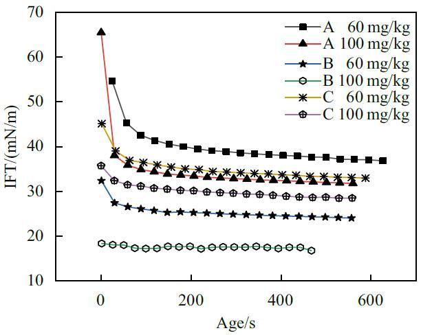 為了充分證明時間效應對懸滴法測定結(jié)果會造成影響,實驗使用懸滴法對A,B,C三種表面活性劑復配溶液較稀含量下的動態(tài)表面張力進行了研究。結(jié)果如圖3所示。