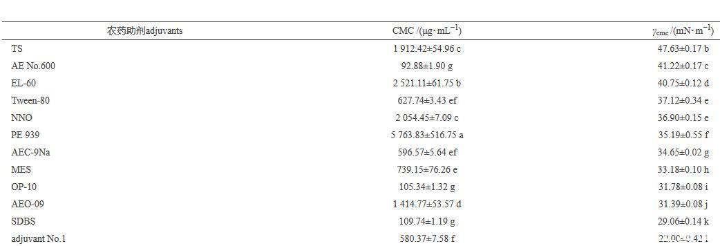 2.2供試助劑的臨界膠束濃度及其對(duì)應(yīng)的表面張力