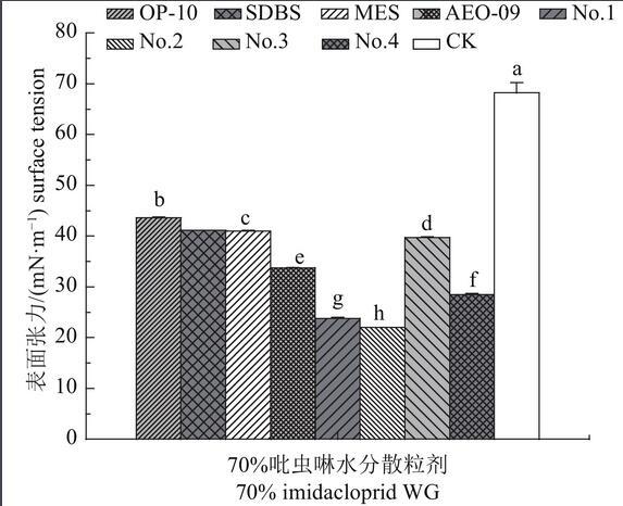 表面張力的大小直接決定了農(nóng)藥制劑在稀釋后能否完全潤(rùn)濕展布在植物表面上,而降低表面張力的常用方法就是在制劑中添加助劑。本次試驗(yàn)通過(guò)添加不同助劑測(cè)定了供試農(nóng)藥表面張力值的變化,結(jié)果如圖2所示。70%吡蟲(chóng)啉WG藥液的表面張力值為(68.21±2.03)mN/m,加入助劑后顯著降低了藥液的表面張力,且不同助劑對(duì)同一種藥液的表面張力降低趨勢(shì)存在顯著差異。其中,篩選出的8種助劑中,助劑1#和2#對(duì)藥液表面張力下降趨勢(shì)最大,效果最好,降低率分別可達(dá)65.13%和67.78%;其次是助劑4#、助劑3#、AEO-09和SDBS,降低率范圍在32.84%~63.96%;脂肪酸甲酯磺酸鈉和OP-10較差,但降低率也可達(dá)26.58%以上。加入助劑1#、2#和4#后,藥液的表面張力降低至小麥葉片正面的臨界表面張力(33.88 mN/m)以下,能較好潤(rùn)濕展布在小麥的葉片正、反面上,極大地增加施藥效果。