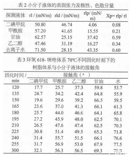 表2為實(shí)驗(yàn)所用小分子液體的表面張力及極性、色散分量,表3為環(huán)氧618-咪唑體系70℃不同固化時(shí)刻下的樹脂體系與小分子液體的接觸角。