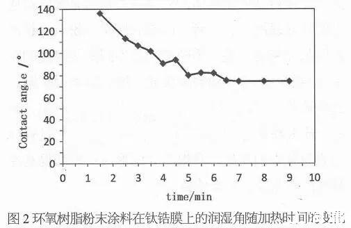 由圖2可知,環(huán)氧樹脂粉末涂料在熔融鋪展過程中的對(duì)鈦鋯膜的潤(rùn)濕角整體呈降低趨勢(shì),潤(rùn)濕角由1.5min時(shí)的136°逐步降低至流平終點(diǎn)的74.6°。