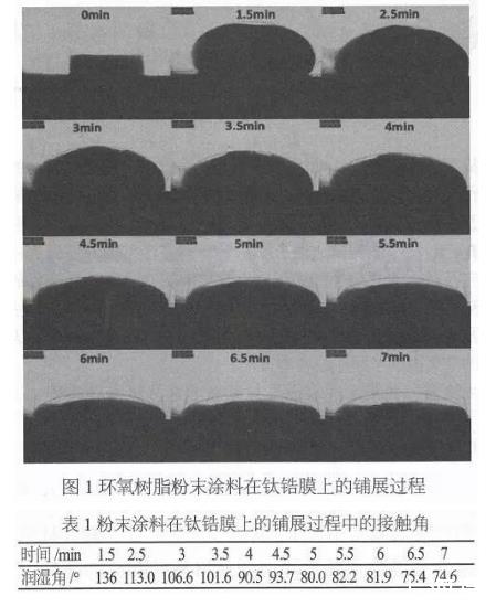 楊雲(yún)予等人利用接觸角測(cè)量?jī)x在恒溫180℃下,拍出了不同時(shí)刻圓柱狀粉末涂料在鋁合金鈦鋯膜上的熔融和鋪展過程圖,并記錄了的潤(rùn)濕角,為研究粉末涂料固化過程中,凝膠前的接觸角變化提供了依據(jù)。