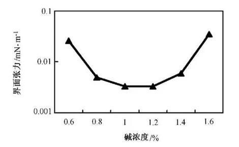 三元復合驅提高采收率的主要手段之一是通過降低油水的界面張力,使油滴在低界面張力條件下容易變形,使殘余油易被驅出。因此,超低界面張力是大幅度提高原油采收率的重要條件。本文重點介紹堿、表面活性劑濃度變化對三元復合體系界面張力的影響。
