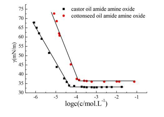 圖 4. 表面張力與水溶液摩爾濃度的對數 蓖麻油酰胺氧化胺和棉籽油酰胺氧化胺在 25攝氏度